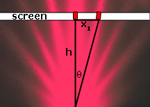 Because the diffraction angle (θ) is difficult to measure, it is easier to mathematically derive it. If the diffraction pattern is projected onto a screen parallel to and a known distance, h, away from the diffracting grating, the distance from the zeroeth order to the nth order, xn can be measured (see figure 2). Because xn and h are perpendicular to each other, a right triangle is formed with the hypotenuse being the line formed from the diffraction source to the nth order line. Therefore, using trigonometry, θ is equal to the Tan-1 of xn divided by h, or: